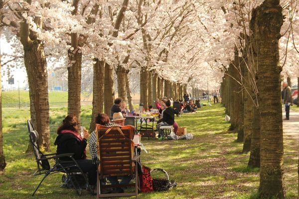 Onder de bloesembomen, langs het fietspad aan de Terracottastraat in de Regenboogbuurt in Almere Buiten.Bekijk evenement Kersenbloesemfeest AlmereEvenement -